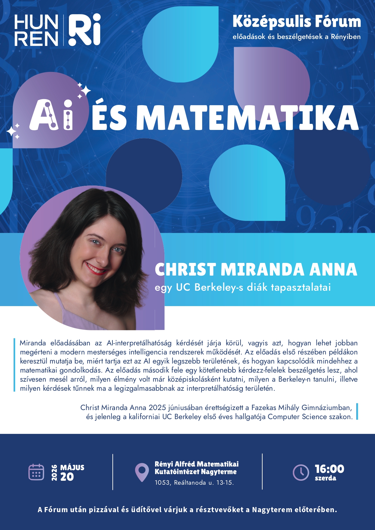 Az előadás második fele egy kötetlenebb kérdezz-felelek beszélgetés lesz, ahol szívesen mesél arról, milyen élmény volt már középiskolásként kutatni, milyen a Berkeley-n tanulni, illetve milyen kérdések tűnnek ma a legizgalmasabbnak az interpretálhatóság területén.